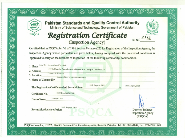 Tti-Inspections( Pvt.) Ltd is also approved Inspection agency from PSQCA for Agricultural Products and Manufacturing Goods to support local and international vendors’ supply chain inspections.
